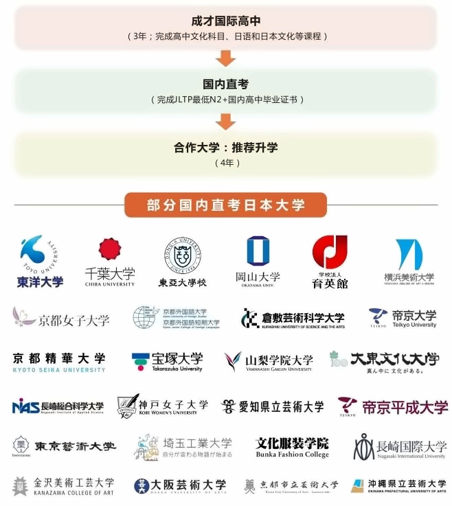 学生在完成2.5年成才国际高中课程的基础上,高三下半学期安排赴日进入日本明德义塾高中或日本语言学校,进行1年考前强化课程学习及校内考的辅导,同时与日本当地学生建立友谊,更快、更顺利地融入日本,在高三毕业次年4月,通过校内推荐或EJU留考,可正式进入日本大学就读专业课程。