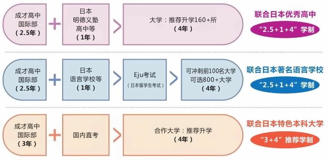 上海成才国际高中日本班对日本高校升学方向的学子,开设日本高校专属升学路线的日高部,学制有“2.5+1+4年”、“3+4年” 等学制,并根据学子们的学业状况、语言等级考试、及未来想升学名校等级状态,开设的多元化的日高部升学通道。