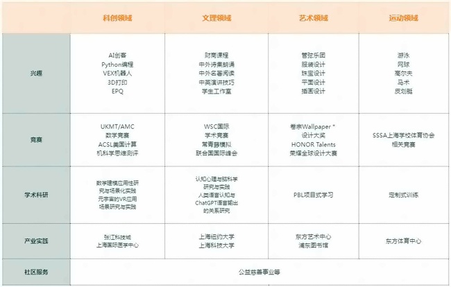上海浦东新区民办籽奥高级中学以核心课程为主体,拓展活动矩阵依托课程、社团、项目等多形式开展,涵盖科创、文理、艺术、运动的四大领域,*含兴趣、竞赛、学术科研、产业实践、社区服务的五类背景提升模块。
