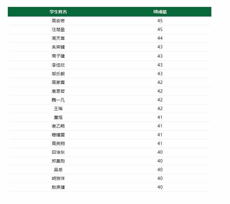 特别值得指出的是,今年有两名同学取得全项满分45分的优质成绩。其中,汪楚盈同学凭借极强的学术能力,已经顺利被牛津大学生物学专业录取;高安若同学凭借优异的学术成绩和出色的艺术创作力,被她所热爱的梦校英国威斯敏斯特大学服装设计专业录取。